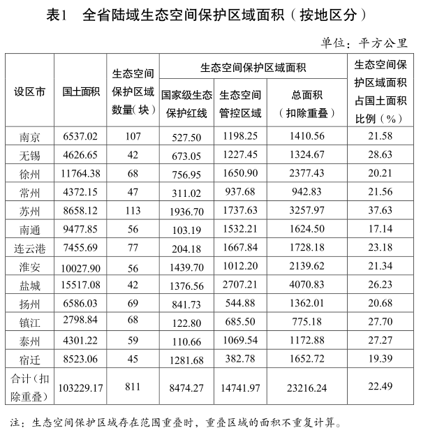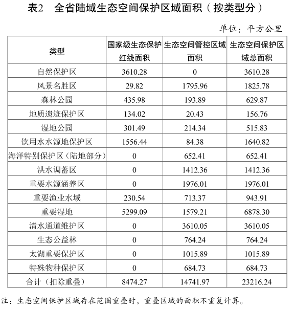 全省陸域共劃定15大類811塊生態(tài)空間保護(hù)區(qū)域,總面積23216.24平方公里,占全省陸域國(guó)土面積的22.49%。其中,國(guó)家級(jí)生態(tài)保護(hù)紅線陸域面積8474.27平方公里,占全省陸域國(guó)土面積的8.21%;生態(tài)空間管控區(qū)域面積14741.97平方公里,占全省陸域國(guó)土面積的14.28%。